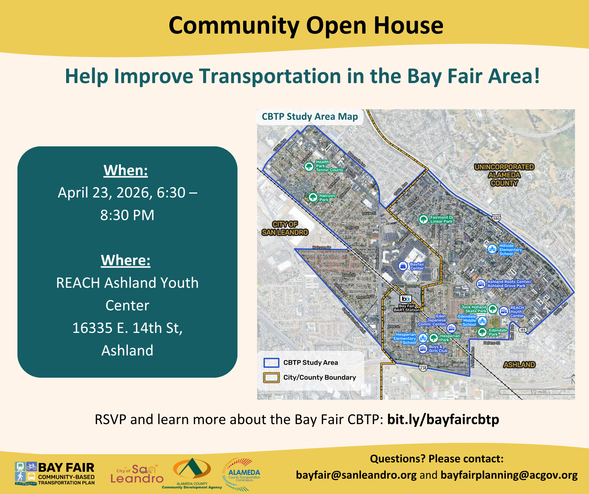 Help make transportation safer and more convenient in the Bay Fair Area! Join Alameda County and the City of San Leandro for our Community Open House with snacks, a kids' coloring station, and giveaways.